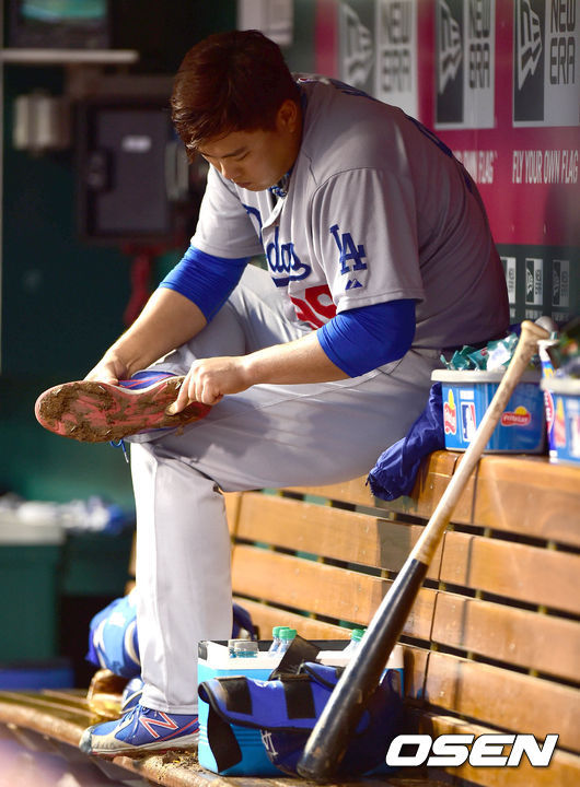 류현진이 더그아웃에서 스파이크에 묻은 진흙을 털어내고 있다. 류현진은 경기 전 폭우로 마운드기 미끄러워 투구중 미끄러지는 상황도 맞이했다.