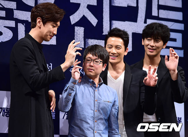 배우 지성, 주지훈, 이광수, 이도윤 감독이 12일 오전 서울 신사동 CGV압구정에서 열린 영화 '좋은 친구들' 제작보고회에 참석해 포토타임을 준비하고 있다.