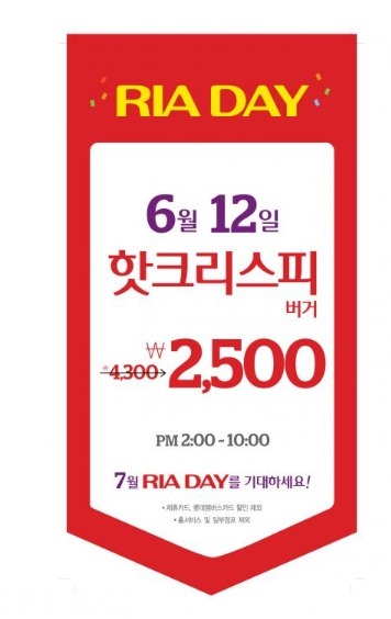 6월 리아데이를 맞아 핫 크리스피버거가 42% 할인된 2500원에 판매되는 것. 할인은 오후 2시부터 10시까지 진행된다.