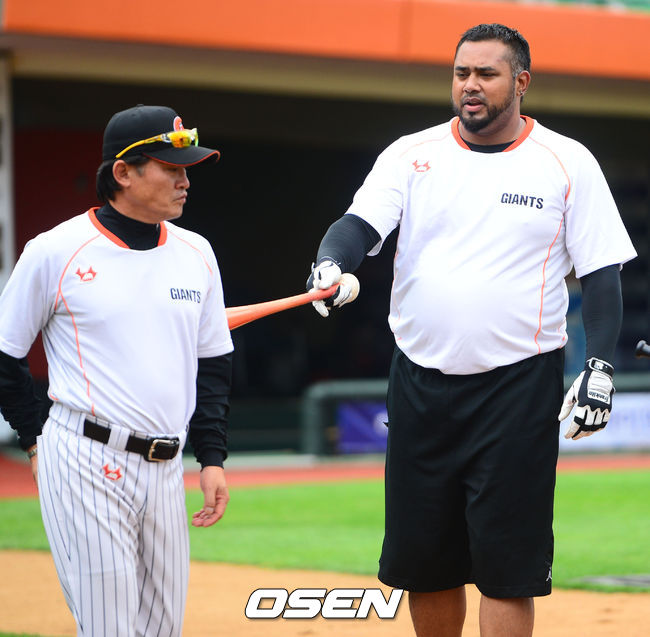 12일 오후 부산 사직구장에서 열리는 2014 한국야쿠르트 세븐 프로야구 롯데 자이언츠와 LG 트윈스의 경기에 앞서 롯데 히메네스가 박흥식 타격코치에게 장난을 치고 있다.