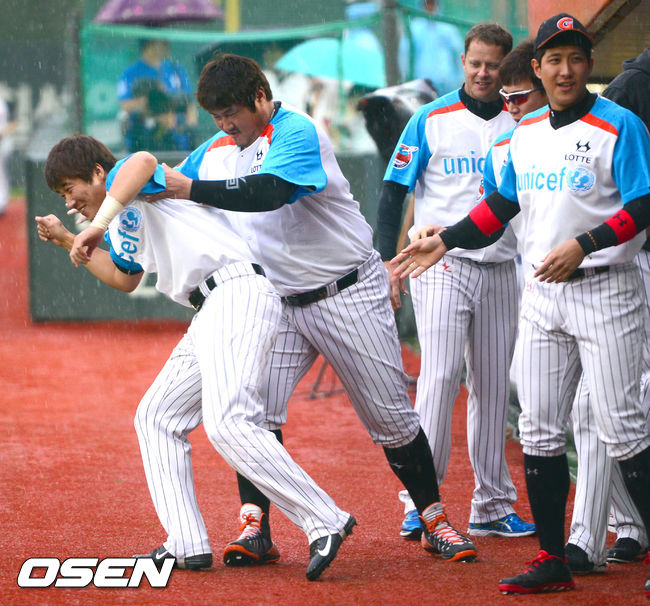 롯데 정훈이 동료들에게 우천 세레모니를 강요에 등떠밀리고 있다. / soul1014@osen.co.kr