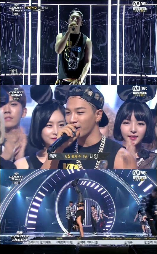 태양은 12일 방송된 엠넷 음악프로그램 ‘엠카운트다운’에서 컴백 무대 직후 1위를 차지한 다음 “사장님(양현석)에게 감사드린다”면서 소속사 스태프, 부모, 팬들에게 감사 인사를 했다.