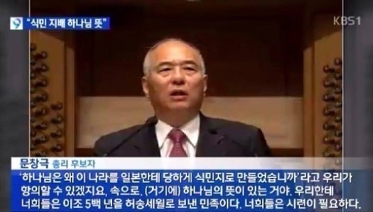 문창극 후보자는 지난 2011년 자신이 장로로 있는 서울 온누리교회 특별 강연에서 “하나님이 이 나라를 일본의 식민지로 만든 건 하나님의 뜻”이라고 밝혔다.