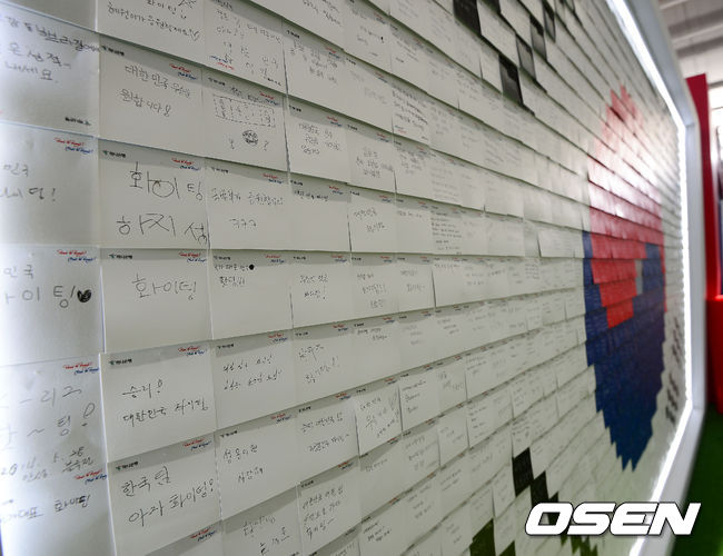 페드로 바소 경기장 기자회견장인 코리아 하우스에 수많은 팬들의 염원이 담긴 종이들이 태극기 모양으로 부착되어 있다.