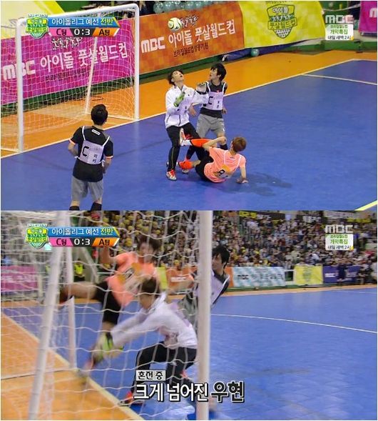 인피니트 멤버 우현이 ‘아이돌 풋살 월드컵’에서 공을 쫓다가 혼전 속에 충돌한 장면이 공개됐다.