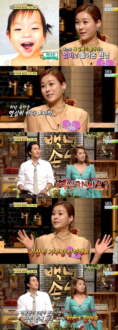 현영의 출연에 MC들은 미모가 여전하다고 칭찬했다. 이에 현영은 “육아를 열심히 하다보니까 다른 관리 없이도 살이 쑥쑥 빠진다”고 말했다.