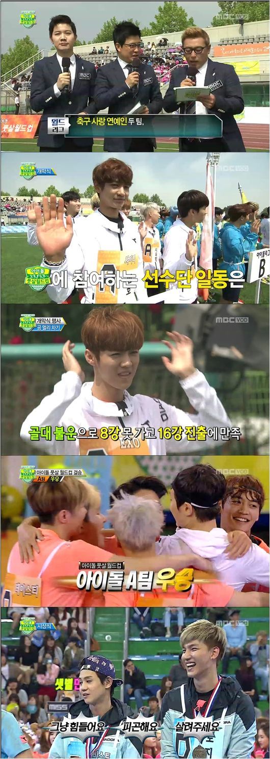 한편 ‘아이돌 풋살 월드컵’은 김성주, 이병진, 김정근, 슈퍼주니어 신동, 조세호, 남창희가 진행을 맡았으며 이창환, 서형욱이 해설을 책임졌다. 비스트, 비투비, 노지훈, 김흥국, 김창렬, 유건, 샘 해밍턴, 샤이니, 엑소, 인피니트, 제국의 아이들, B1A4, 미쓰에이, 씨스타, 선미, 애프터스쿨 등이 참여했다.