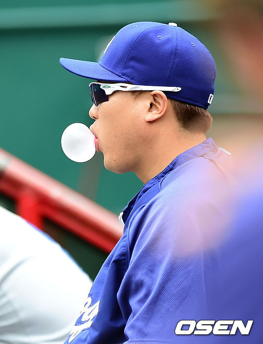 13일 새벽(한국시간) 신시내티에서 열린 신시내티 레즈와 LA 다저스의 경기, LA 다저스 류현진이 더그아웃에서 경기를 관전하고 있다.