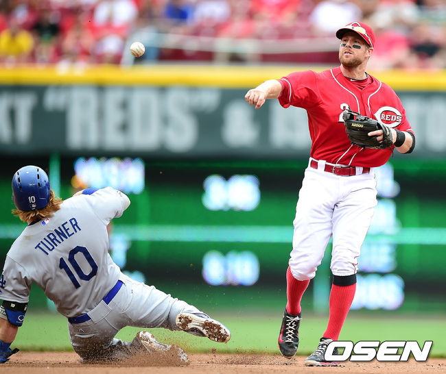13일 새벽(한국시간) 신시내티에서 열린 신시내티 레즈와 LA 다저스의 경기, 6회초 무사 1루 신시내티 코자트가 LA 다저스 푸이그의 2루 땅볼때 1루주자 터너를 포스아웃으로 잡아낸 뒤 1루로 송구하고 있다. 결과는 1루 세이프.