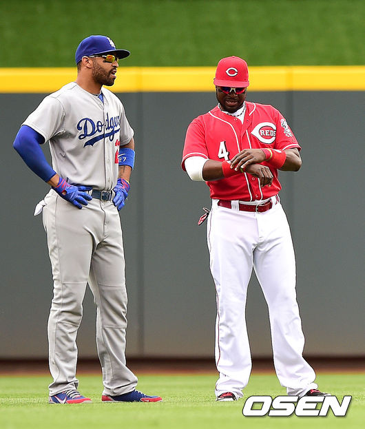 13일 새벽(한국시간) 신시내티에서 열린 신시내티 레즈와 LA 다저스의 경기에 앞서 LA 다저스 맷 켐프와 신시내티 필립스가 이야기를 나누고 있다.
