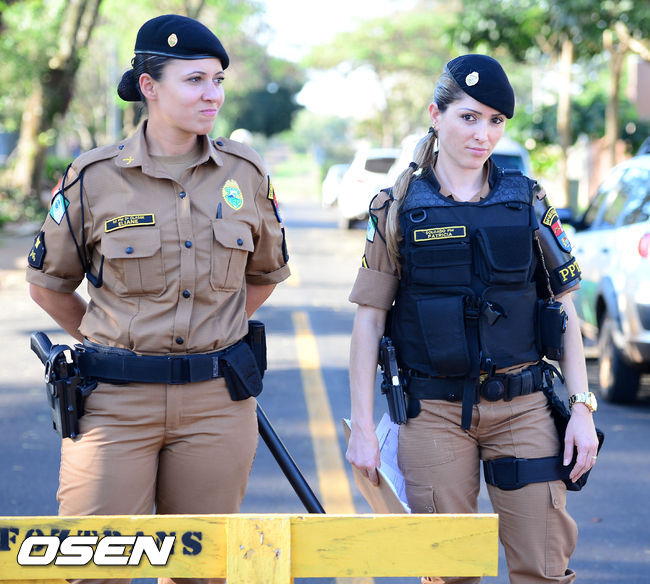 [OSEN=브라질 이구아수, 민경훈기자] 12일 오후(현지시간) 홍명보감독이 이끄는 축구대표팀이 이구아수(이과수)의 페드로 바소경기장에서 훈련을 할 예정인 가운데 홍명보호가 훈련을 하는 페드로 바소 경기장에서 앞에 브라질 여자 경찰들이 권총을 차고 보초를 서고 있다.