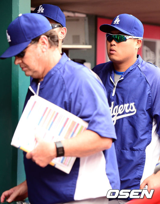 경기에서 패한 다저스 류현진과 허니컷 코치가 더그아웃을 나서고 있다./ youngrae@osen.co.kr
