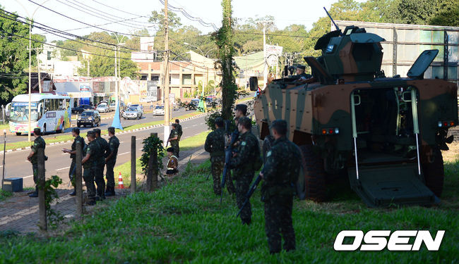 [OSEN=브라질 이구아수, 민경훈기자] 12일 오후(현지시간) 홍명보감독이 이끄는 축구대표팀이 이구아수(이과수)의 페드로 바소경기장에서 훈련을 할 예정인 가운데 홍명보호가 버스를 타고 페드로 바소경기장에 도착할때 브라질 장갑차가 보초를 서고 있다.