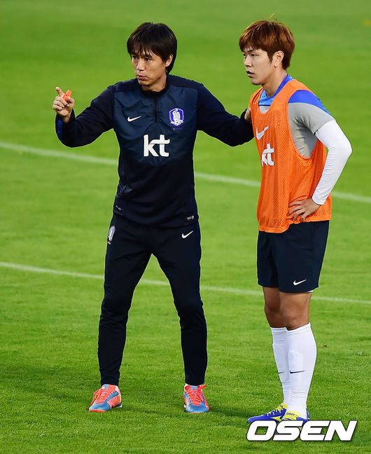 [OSEN=브라질 이구아수, 민경훈기자] 12일 오후(현지시간) 홍명보감독이 이끄는 축구대표팀이 이구아수(이과수)의 페드로 바소경기장에서 훈련 중 홍명보 감독이 김영권에게 지시를 내리고 있다.