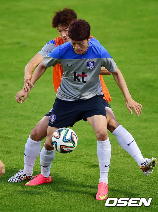 [OSEN=브라질 이구아수, 민경훈기자] 12일 오후(현지시간) 홍명보감독이 이끄는 축구대표팀이 이구아수(이과수)의 페드로 바소경기장에서 훈련 중 이청용이 박종우와 볼다툼을 하고 있다.