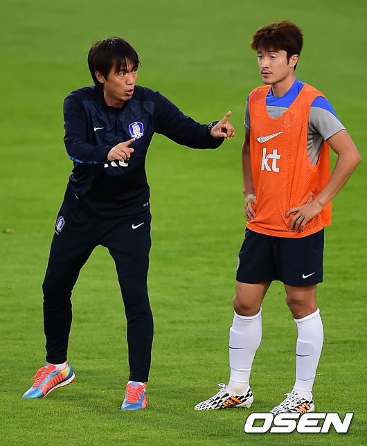 [OSEN=브라질 이구아수, 민경훈기자] 12일 오후(현지시간) 홍명보감독이 이끄는 축구대표팀이 이구아수(이과수)의 페드로 바소경기장에서 훈련 중 홍명보 감독이 지시를 내리고 있다.