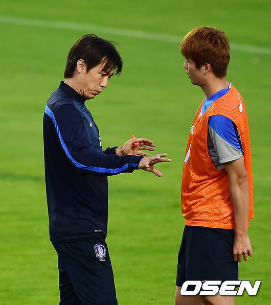 [OSEN=브라질 이구아수, 민경훈기자] 12일 오후(현지시간) 홍명보감독이 이끄는 축구대표팀이 이구아수(이과수)의 페드로 바소경기장에서 훈련 중 홍명보 감독이 기성용과 얘기를 나누고 있다.