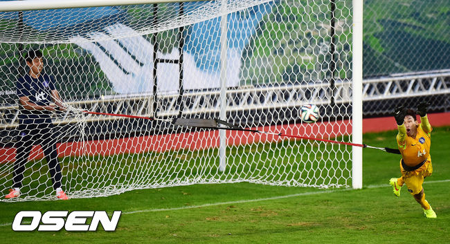 [OSEN=브라질 이구아수, 민경훈기자] 12일 오후(현지시간) 홍명보감독이 이끄는 축구대표팀이 이구아수(이과수)의 페드로 바소경기장에서 훈련 중 김승규가 몸에 줄을 묶고 훈련을 하고 있다.