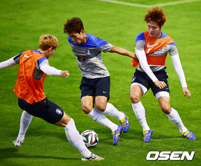[OSEN=브라질 이구아수, 민경훈기자] 12일 오후(현지시간) 홍명보감독이 이끄는 축구대표팀이 이구아수(이과수)의 페드로 바소경기장에서 훈련 중 박주영이 손흥민과 김영권을 돌파하고 있다.