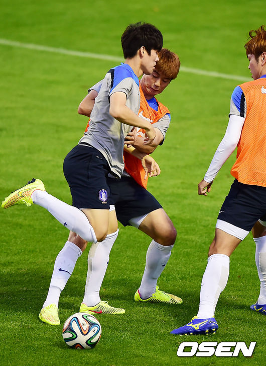 [OSEN=브라질 이구아수, 민경훈기자] 12일 오후(현지시간) 홍명보감독이 이끄는 축구대표팀이 이구아수(이과수)의 페드로 바소경기장에서 훈련 중 기성용이 김창수의 볼을 뺏고 있다.