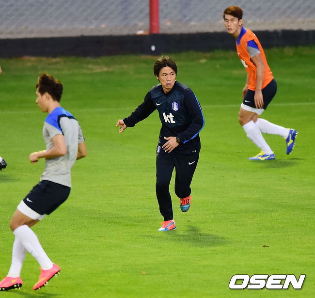 [OSEN=브라질 이구아수, 민경훈기자] 12일 오후(현지시간) 홍명보감독이 이끄는 축구대표팀이 이구아수(이과수)의 페드로 바소경기장에서 훈련 중 홍명보 감독이 시범을 보이고 있다.