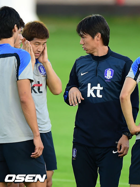 [OSEN=브라질 이구아수, 민경훈기자] 12일 오후(현지시간) 홍명보감독이 이끄는 축구대표팀이 이구아수(이과수)의 페드로 바소경기장에서 훈련 중 홍명보 감독이 박주호에게 말을 하고 있다.