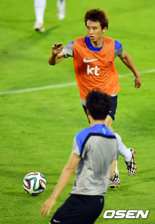 [OSEN=브라질 이구아수, 민경훈기자] 12일 오후(현지시간) 홍명보감독이 이끄는 축구대표팀이 이구아수(이과수)의 페드로 바소경기장에서 훈련 중 구자철이 돌파를 시도하고 있다.