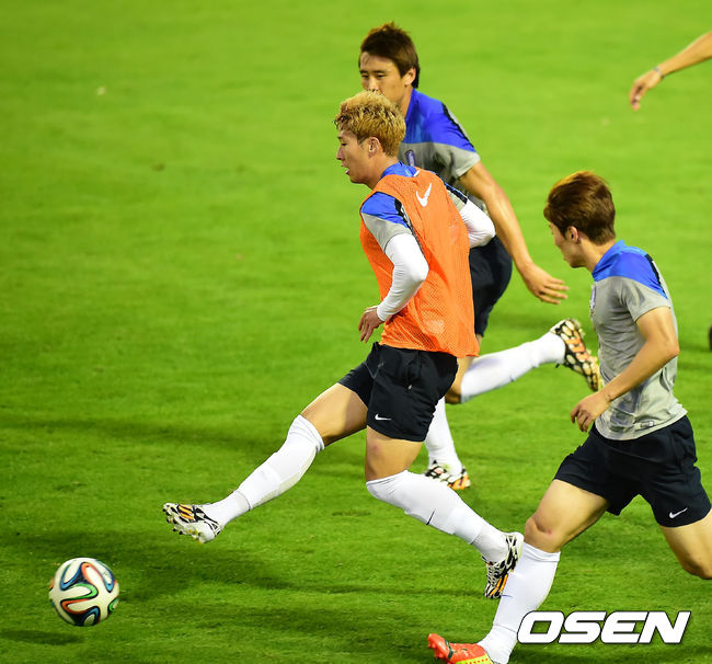 [OSEN=브라질 이구아수, 민경훈기자] 12일 오후(현지시간) 홍명보감독이 이끄는 축구대표팀이 이구아수(이과수)의 페드로 바소경기장에서 훈련 중 손흥민이 패스 연결을 하고 있다.