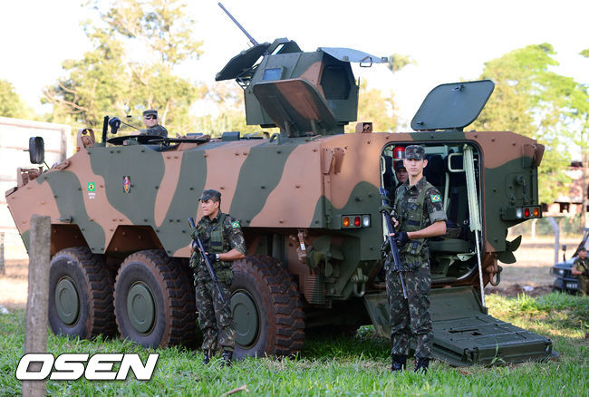 [OSEN=브라질 이구아수, 민경훈기자] 12일 오후(현지시간) 홍명보감독이 이끄는 축구대표팀이 이구아수(이과수)의 페드로 바소경기장에서 훈련을 할 예정인 가운데 홍명보호가 버스를 타고 페드로 바소경기장에 도착할때 브라질 장갑차가 보초를 서고 있다.