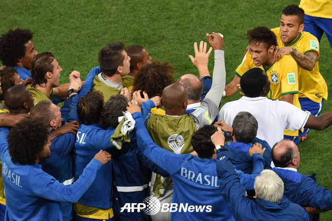 개막전 브라질과 크로아티아의 경기 후반 역전골을 넣은 브라질 네이마르가 동료들과 기뻐하고 있다. /photo@osen.co.kr