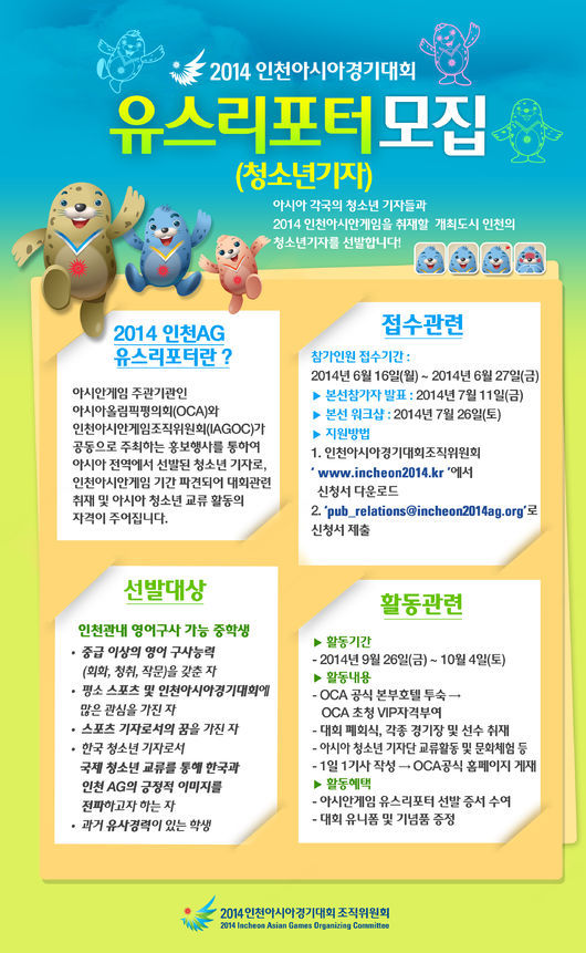 2014인천아시아경기대회 조직위원회(위원장 김영수)가 오는 16일부터 27일까지 인천시 관내 중학생을 대상으로 인천아시안게임을 취재할 유스리포터(청소년 기자)를 모집한다.
