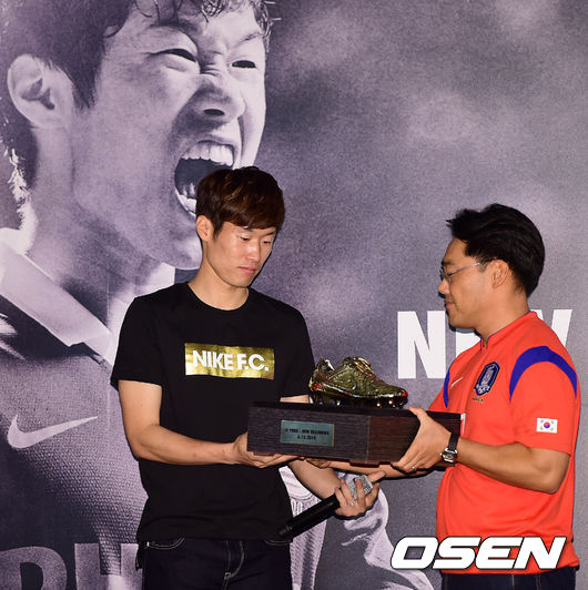 박지성이 '뉴 비기닝(NEW BEGINNING)' 팬미팅에 참석해 나이키 코리아 피터 곽 사장에게 골든슈를 전달받고 있다.