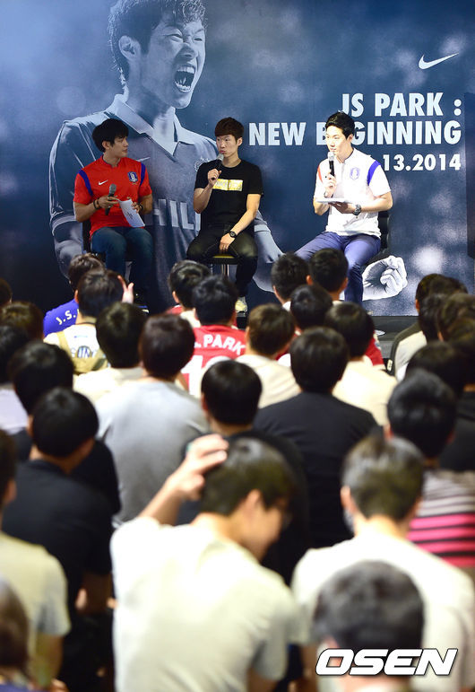 박지성이 '뉴 비기닝(NEW BEGINNING)' 팬미팅에 참석해 배우 박재민, 김동완 축구 해설위원과 인사말을 하고 있다.
