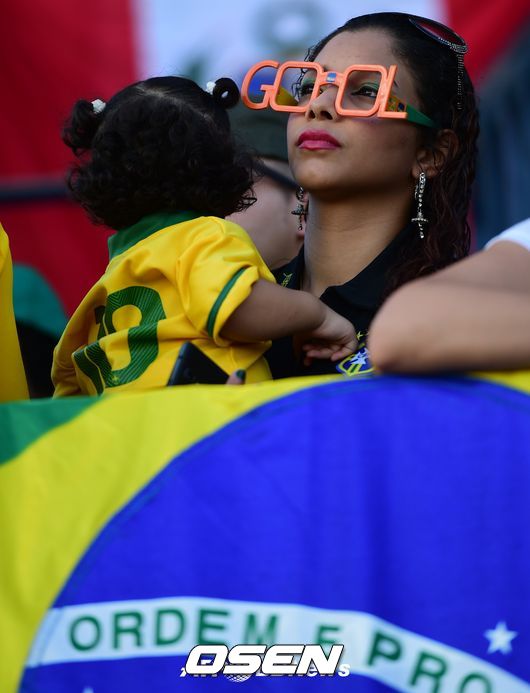 개막전 브라질 대 크로아티아 경기에서 브라질 여성관중이 이색 안경을 착용한채 경기를 관람하고 있다.