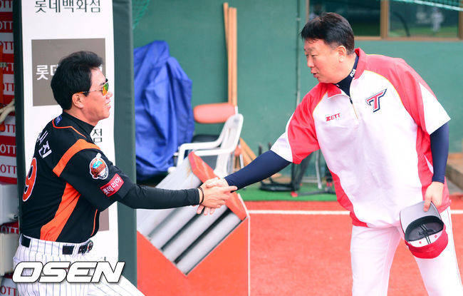 13일 부산 사직구장에서 열리는 2014 한국야쿠르트 세븐 프로야구 롯데 자이언츠와 KIA 타이거즈의 경기에 앞서 롯데 김시진 감독과 KIA 선동렬 감독이 악수를 나누고 있다.