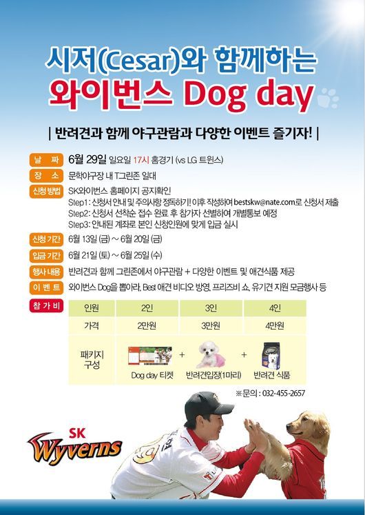 SK 와이번스(대표이사 임원일)는 6월 29일(일) LG 트윈스와의 홈경기를 맞아 ‘시저(Cesar)와 함께하는 와이번스 Dog day’ 행사를 실시한다.