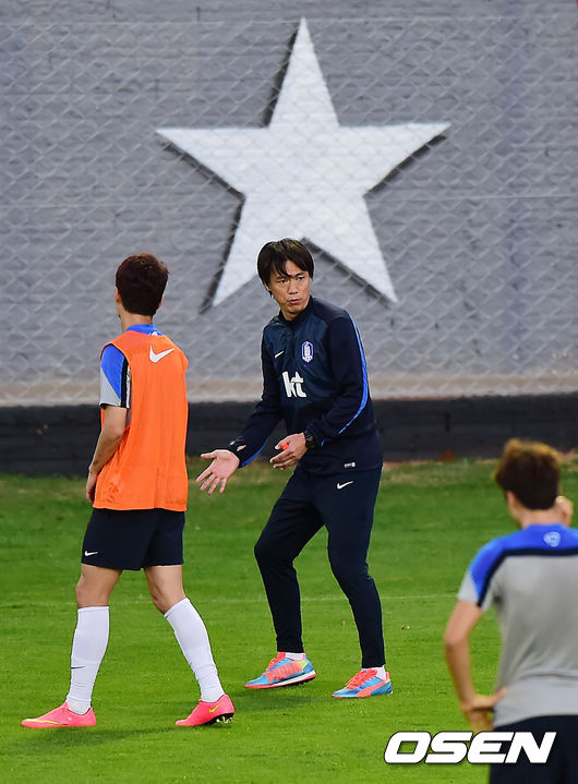 [OSEN=브라질 이구아수, 민경훈기자] 12일 오후(현지시간) 홍명보감독이 이끄는 축구대표팀이 이구아수(이과수)의 페드로 바소경기장에서 훈련 중 홍명보 감독이 지시를 내리고 있다.
