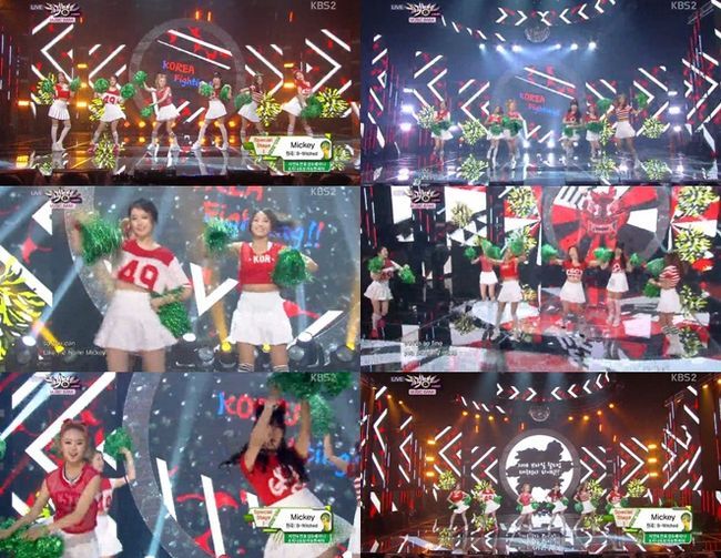 13일 오후 방송된 KBS 2TV '뮤직뱅크'에서 지연, 전효성, 레이나, 보라, 지나, 엔씨아 등 6인은 B-Witched의 'Mickey'로 화려한 치어리딩을 펼쳐 눈길을 사로잡았다.