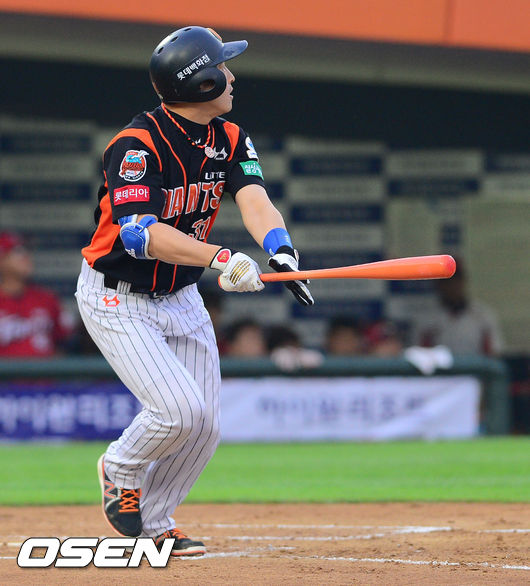 13일 부산 사직구장에서 열리는 2014 한국야쿠르트 세븐 프로야구 롯데 자이언츠와 KIA 타이거즈의 경기, 1회말 무사 1,2루 롯데 손아섭이 선취 1타점 인정2루타를 날리고 있다.