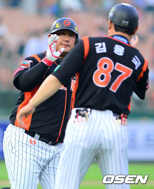 13일 부산 사직구장에서 열리는 2014 한국야쿠르트 세븐 프로야구 롯데 자이언츠와 KIA 타이거즈의 경기, 1회말 무사 만루 롯데 최준석이 만루 홈런을 날리고 김응국 코치와 하이파이브를 하고 있다