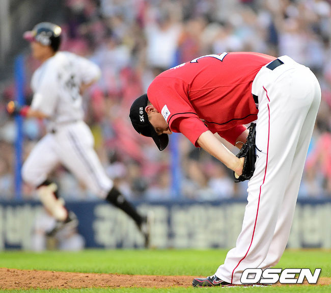4회말 LG 공격 1사 주자없는 상황 이진영에게 앞서가는 중월 솔로포를 허용한 SK 선발 울프가 아쉬워하고 있다.