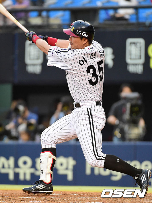 4회말 LG 공격 1사 주자없는 상황 이진영이 앞서가는 중월 솔로포를 날리고 있다.