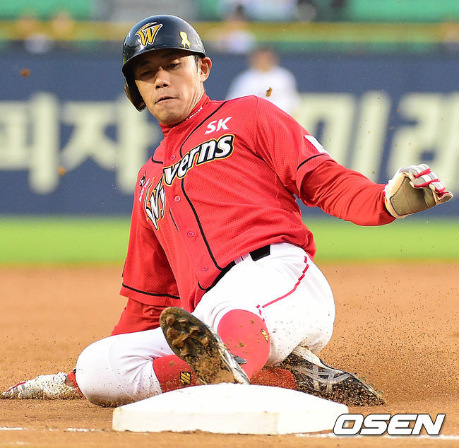 5회초 SK 공격 2사 1루 상황 김성현의 중전안타 때 1루 주자 이명기가 3루까지 내달려 세이프되고 있다.