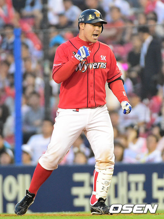5회초 SK 공격 2사 만루 상황 이재원이 역전 2타점 적시타를 날리고 1루에 안착한 뒤 주먹을 불끈 쥐며 환호하고 있다.