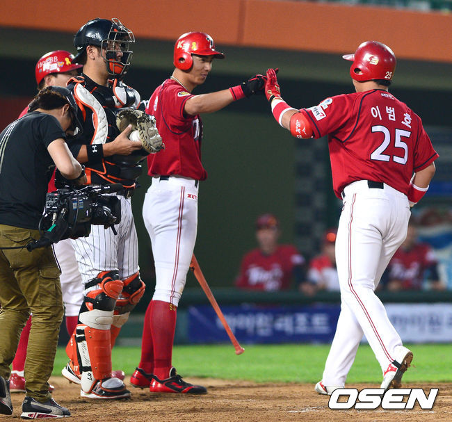 13일 부산 사직구장에서 열리는 2014 한국야쿠르트 세븐 프로야구 롯데 자이언츠와 KIA 타이거즈의 경기, 3회초 2사 1,2루 KIA 이범호가 3점 홈런을 날리고 홈에서 동료들과 하이파이브를 하고 있다.
