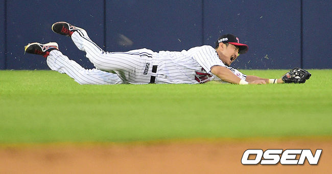 5회초 SK 공격 2사 1, 3루 상황 김강민의 1타점 중전 적시타 때 LG 중견수 박용택이 몸을 날려 잡으려 했지만 아쉽게 놓치고 있다.