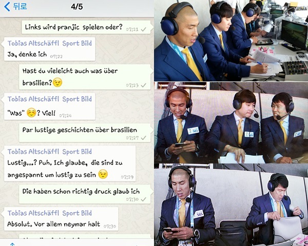 차위원은 독일 최대 일간지인 빌트지가 32개국 담당 기자를 모두 배정했다는 소식을 듣고는 곧바로 친분이 두터웠던 이 신문의 월드컵 담당기자들과 카카오톡 그룹대화창을 만들었다. 이후 개막전이 시작되기 전부터 꾸준히 브라질, 크로아티아를 담당하는 기자들과 실시간으로 대화를 주고받으며 유럽에서 가장 생생한 정보를 입수해 이날 중계를 준비해왔던 것이다.