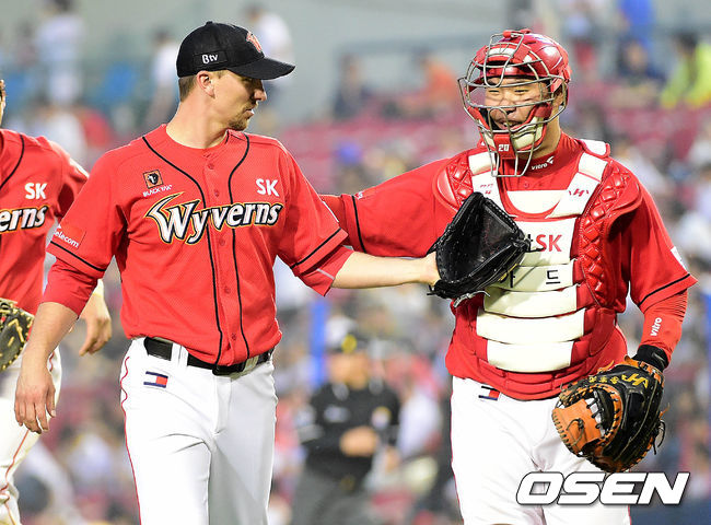 5회말 LG 공격을 삼자범퇴로 막아낸 SK 선발 울프와 포수 이재원이 인사를 나누며 더그아웃으로 들어오고 있다.
