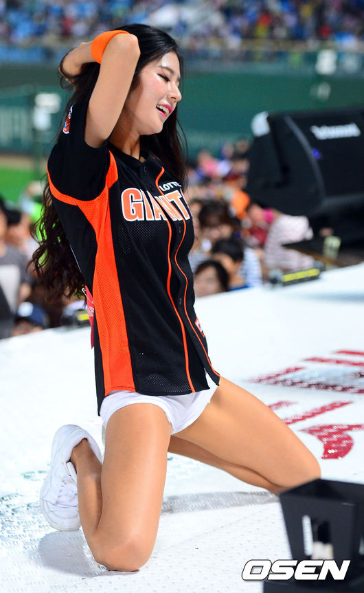 13일 부산 사직구장에서 열린 2014 한국야쿠르트 세븐 프로야구 롯데 자이언츠와 KIA 타이거즈의 경기,롯데 치어리더가 멋진 공연을 펼치고 있다.
