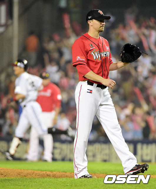 7회말 LG 공격 선두타자로 나선 이진영에게 우월 솔로포를 허용한 SK 선발 울프가 아쉬워하고 있다. 3연타석 홈런 허용.